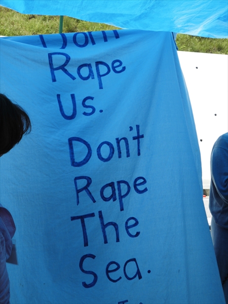 抗議のカヌー隊が沖へ漕ぎ出す。