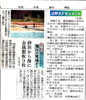 今日の辺野古(5日&6日)~世界へ共感広がる 辺野古で新基地建設に抵抗する沖縄の人たちに対する 共感の波が、国際的な広がりを見せている。 琉球新報 11月6日 抗議を無視して日々進められる埋め立てに向けた作業・工事。シュワーブ基地内では、 建物の解体に続いて、森林の伐採も始まっているという。 琉球新報11月6日 地元新聞の記事より, 沖縄~平和のメッセージ 2014年11月9日unaiリンクURL この記事を共有する → Tweet Pin It