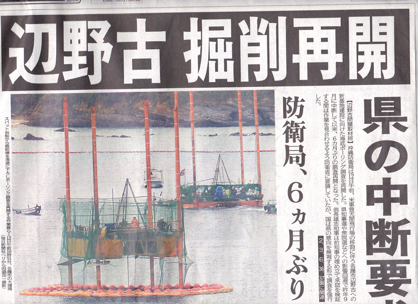 辺野古 掘削再開 政府・沖縄防衛局は、知事選への影響を恐れて中断していた 新基地建設工事に向けての海底ボーリング調査を、12日午前、半年ぶりに再開した。 琉球新報(12日) 「前知事による埋め立て承認の検証結果が出るまで、工事を見合わせるように」との翁長知事の要求を無視しての強行である。 地元新聞の記事より, 沖縄~平和のメッセージ 2015年3月13日unaiリンクURL この記事を共有する → Tweet Pin It