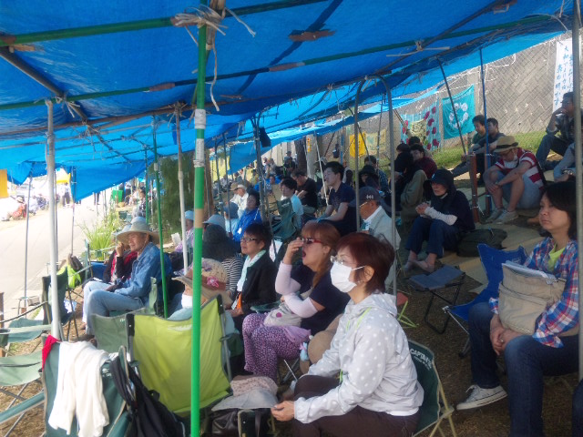 座り込みテントに幸せの黄色いハンカチを掲げた。