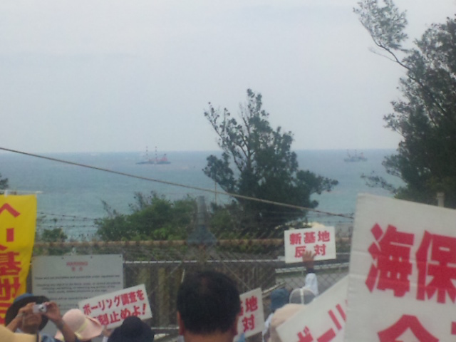 今日はまず第三ゲートに向かい、海上で抗議行動を展開するカヌー・辺野古ブルーと抗議船・辺野古レインボーへ声援を送った。