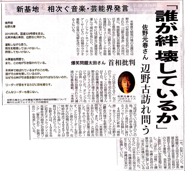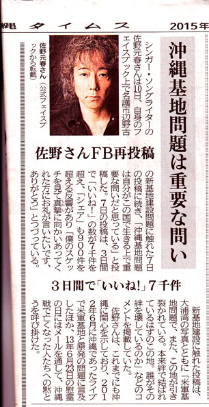 辺野古NO 全国へ広がる共感~佐野元春さん・太田光さん <5月9日 琉球新報より> 佐野元春さんは、実際に辺野古を訪れ、その上で発信していることが、信頼できるし嬉しい。 佐野さんのフェイスブックの投稿にはその後3日間で7000件の「いいね」があり賛意が多かったが、一方でネット右翼からの嫌がらせやファンから「がっかりした」という反応も少なからずあったということです。 5月11日 沖縄タイムス 地元新聞の記事より, 沖縄~平和のメッセージ 2015年5月13日unaiリンクURL この記事を共有する → Tweet Pin It