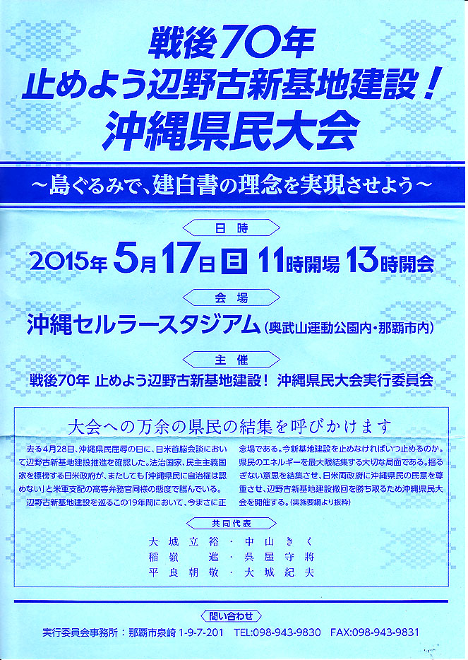 5・17県民大会に行こう! 来る17日(日)那覇市内の沖縄セルラースタジアムで 島ぐるみ県民大会が開催されます。 辺野古新基地建設を止める為、主催者では3万人の結集を目標にかかげ 広く県民に参加を呼び掛けています。 翁長知事も参加します。 沖縄~平和のメッセージ 2015年5月12日unaiリンクURL この記事を共有する → Tweet Pin It