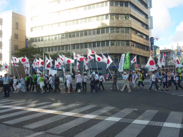 夕方那覇に戻ると、平和行進に対抗しているつもりか、国際通りを100名ほどの日の丸の行列が…。