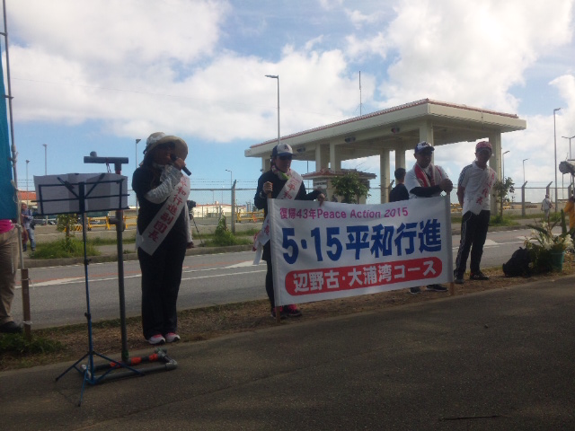 挨拶に立った行進団の団長、副団長は共に若い女性で、折しも毎週金曜日はゲート前行動の指揮は女性が担当することになっており、まさに女性デーの5・15だった。