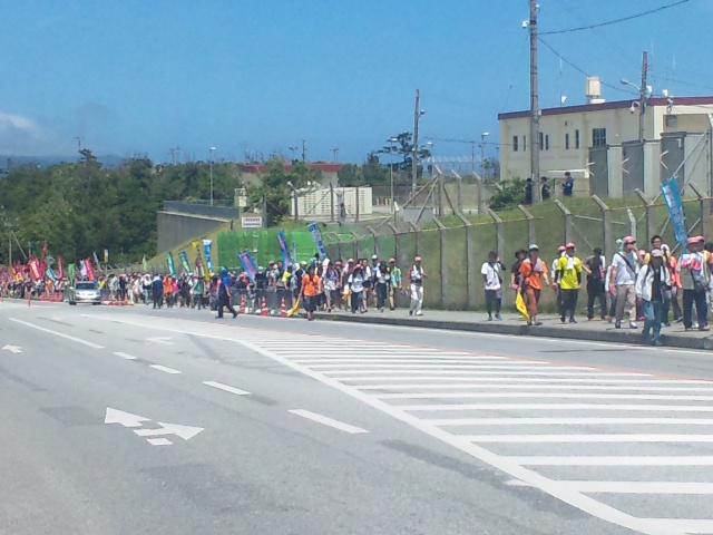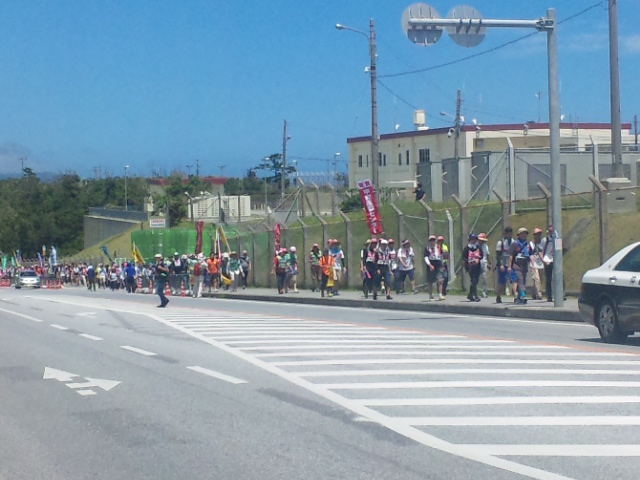 平和行進団と、朝からゲート前に座り込んで抗議行動を続けていた市民を合わせておよそ 1500人が、シュワブ基地のフェンスを包囲し、「沖縄を返せ」をみんなで歌って「辺野古NO」の意志を表明した。