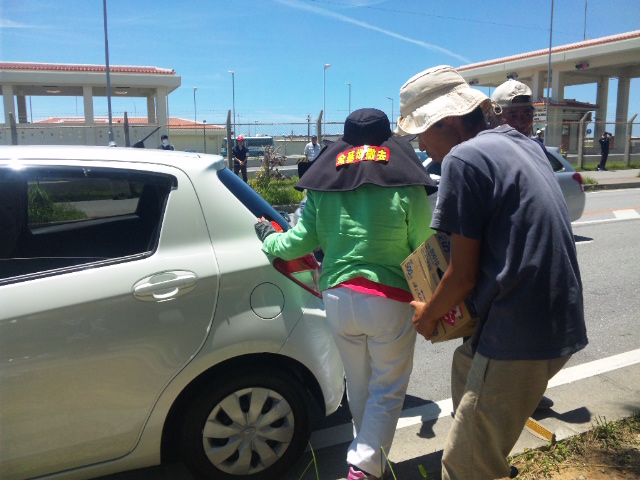 12日に通過した台風の影響で、海上の掘削作業は中止されたままで、ゲート前行動は主に、基地に出勤する米兵に「70年にわたるあなた方米軍の駐留は十分すぎるほど長い。どうぞ本国に帰ってください」とアピールした。