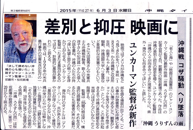 沖縄の抵抗の歴史を映画に~「沖縄 うりずんの雨」ユンカーマン監督 日本のなかで、何故これほどまでに沖縄が抑圧され差別され続けなければならないのか! もしかしたらこの映画で何かつかめるだろうか。 東京は岩波ホールで、沖縄は桜坂劇場で6月20日から上映。 地元新聞の記事より, 沖縄~平和のメッセージ 2015年6月14日unaiリンクURL この記事を共有する → Tweet Pin It