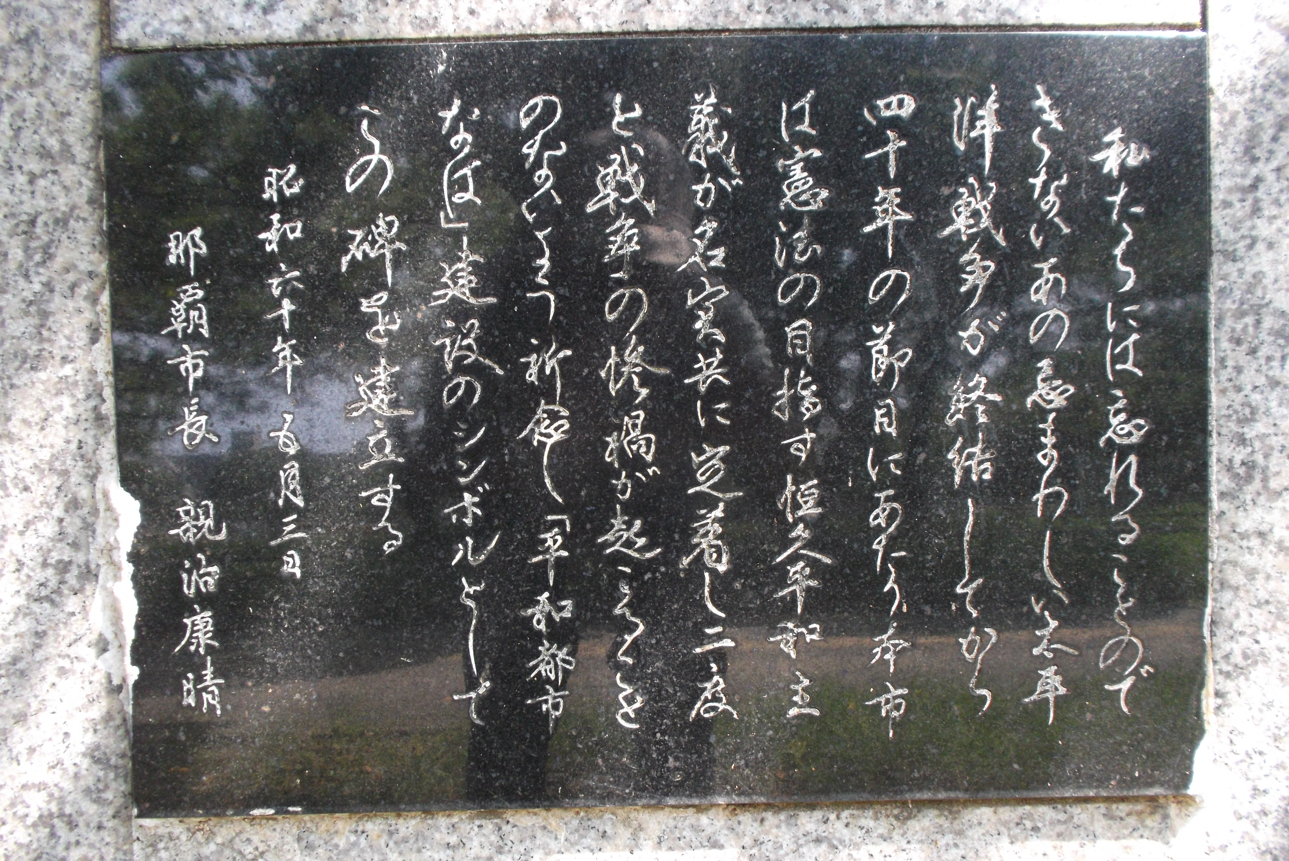 台座に刻まれた由来の碑文には、「本市は憲法の目指す恒久平和主義が名実共に定着し二度と戦争の惨禍が起こることのないよう祈念し『平和都市なは』建設のシンボルとしてこの碑を建立する」と、当時の親泊康晴市長の名で記してある。