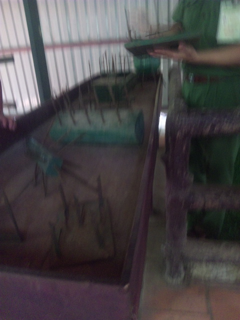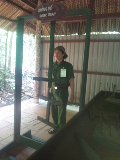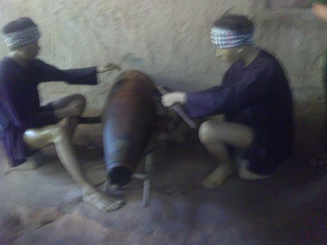 ベトナム戦争で、米軍はあらん限りの残虐行為をベトナムの人たちに行っている。それに対抗するためには、こんな仕掛けも必要だったのだろう。が、鉄の針山に突き刺されたまま何日も苦しみもだえ、やがて死んでいく人間を想像して、私は、冷たい汗をかいて身震いした。他にも拷問のための道具がいくつも展示されていた。