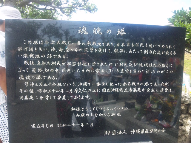 戦後、累々と野ざらしになっていた戦没者の遺骨を拾い集めて祀ったのが、この「魂魄の塔」である。戦争で亡くなった家族の遺骨が見つからなかったり、どこで死んだのかわからない遺族は、ここへお参りに来る。