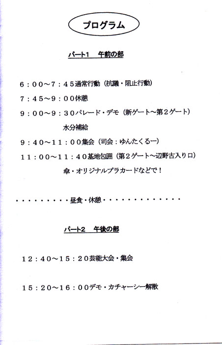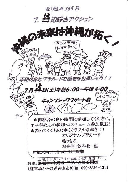辺野古座り込み一年~辺野古アクション 台風で延期された「辺野古座り込み一年、辺野古アクション」が 18日(土)キャンプシュワーブゲート前で行われます。 昨年7月6日から始まったゲート前座り込みの一年を心に刻み、辺野古の海を守るため、あきらめない決意を新たにする節目の行動です。 「アベ戦争法案」の強行採決に抗議への抗議も含め ゲート前へ集まりましょう!! 沖縄~平和のメッセージ 2015年7月16日unaiリンクURL この記事を共有する → Tweet Pin It