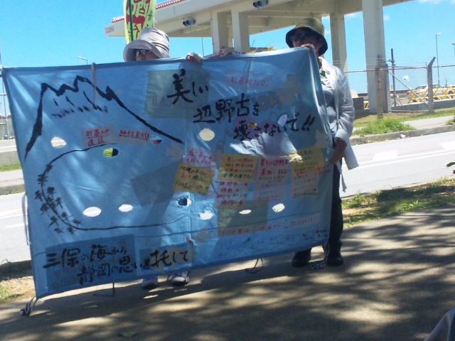 24日のゲート前は、同日11時から海上保安庁への抗議の庁舎包囲が予定されていたことや、台風接近のため、いつもと比べて座り込みの人数は少なく、ピーク時でも100名程度だった。