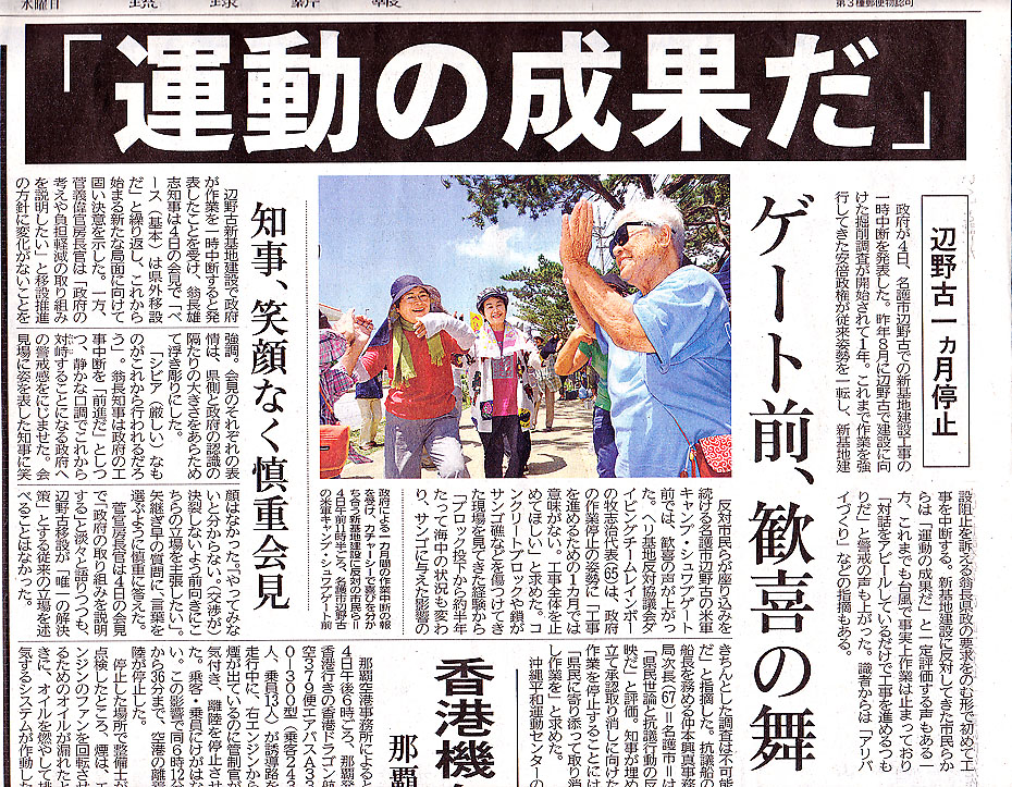 辺野古1ヶ月工事停止~国と県が合意 政府と県は、今月10日から9月9日までの1ヶ月、 移設に関する一切の工事を停止し、 移設について集中的に協議することに合意したと それぞれが会見を開き、発表した。 県内では、「一歩前進」と評価する一方、 「内閣支持率の低下を抑えたいがためのパフォーマンスに利用される」との 警戒感も拡がっている。 海上での工事は、台風などの影響ですでに1ヶ月以上停止したままになっている。 5日 琉球新報 地元新聞の記事より, 沖縄~平和のメッセージ 2015年8月5日unaiリンクURL この記事を共有する → Tweet Pin It