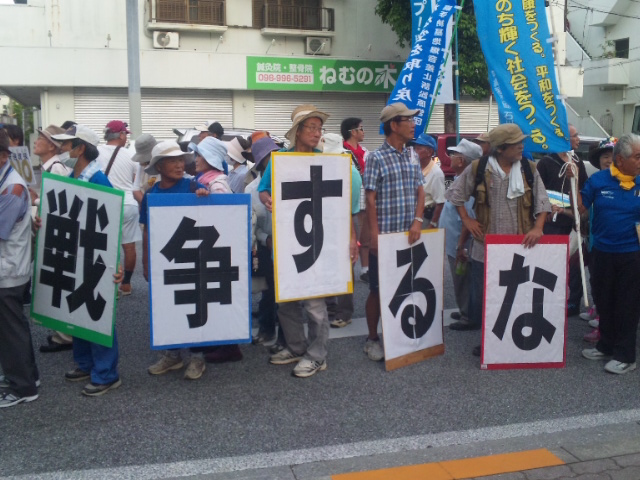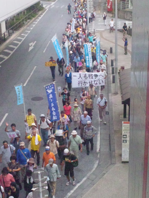 集会後、ひめゆり通り、国際通りを経て県庁前の県民広場までおよそ1時間のデモ行進を行い、道行く人々に「戦争法案廃案!辺野古新基地建設断念!安倍政権退陣をアピールした。