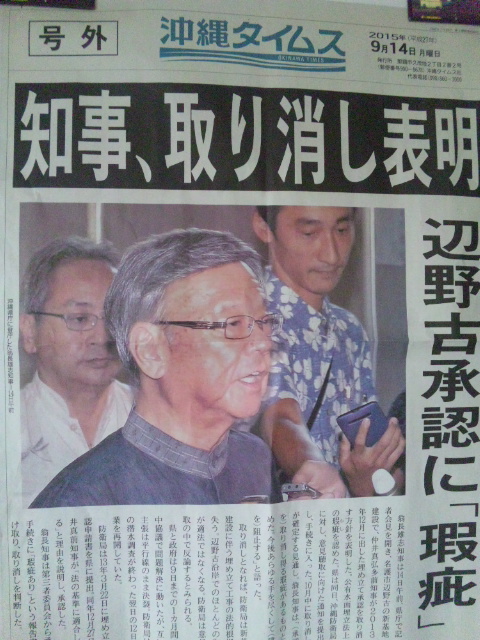 翁長知事 辺野古埋め立て承認の取り消しを表明 翁長知事は14日県庁で記者会見し、辺野古の新基地建設について、 前知事の承認には手続きに法律的な瑕疵があつたとして 取り消すことを表明した。 14日 沖縄タイムス号外 取り消しの手続きには1ヶ月ほどかかり 実際に取り消しが行われるのは10月中旬となるとのこと。 これに対し国は、 法律的に対応しながら「取り消しても工事は進める」としており 辺野古の海上やゲート前で新基地に反対して闘う市民の抵抗が 今後さらに重要かつ厳しくなると予想される。 沖縄~平和のメッセージ 2015年9月15日unaiリンクURL この記事を共有する → Tweet Pin It