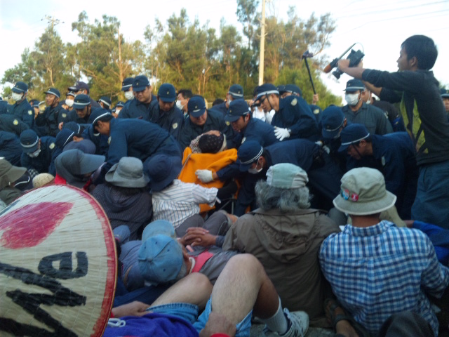 翁長知事の「埋め立て承認取り消し」を、防衛省が一私人として執行停止を申し立て、国交省が裁定するという茶番劇を自作自演する政府の卑劣な行為は、県警機動隊の暴力的な過剰警備となって、辺野古・ゲート前の抗議行動に跳ね返ってくる。