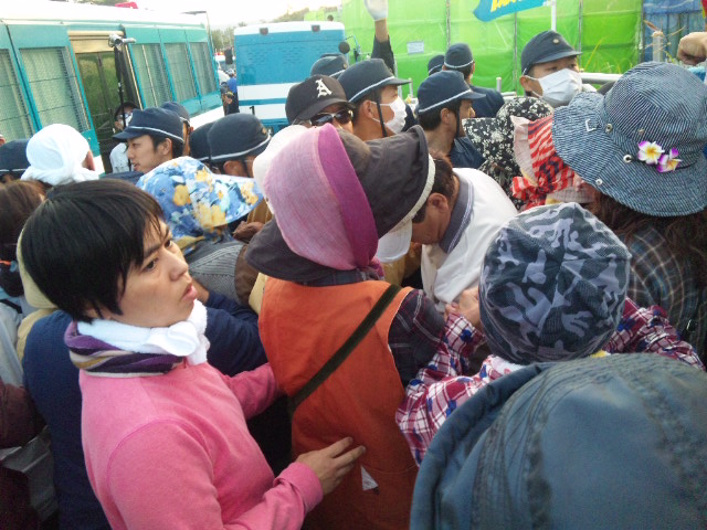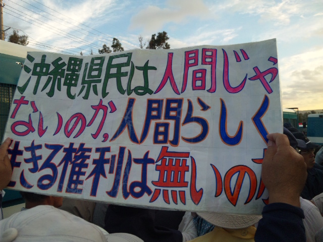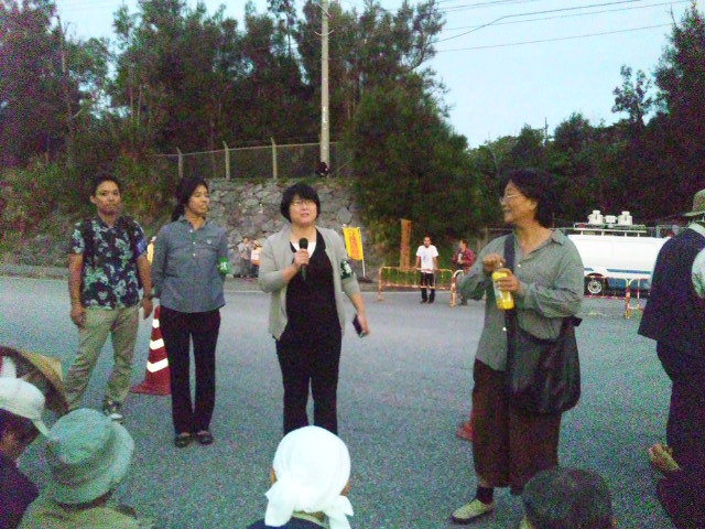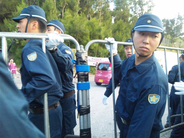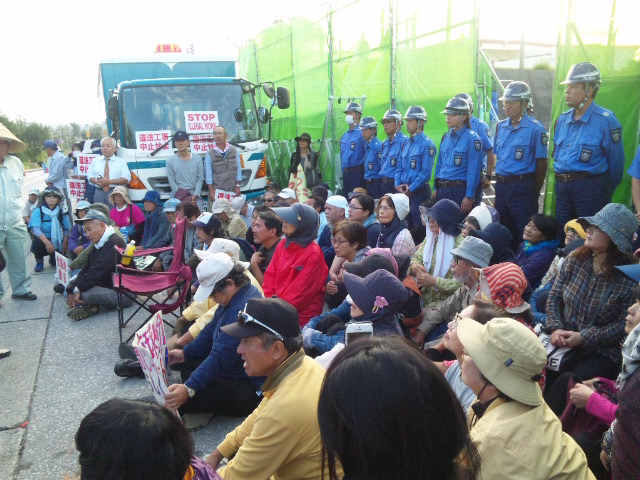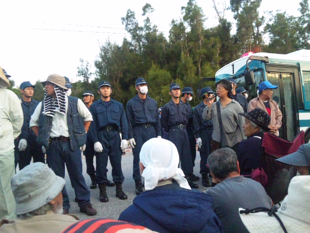工事用ゲートに座り込む市民に、東京から投入された警視庁機動隊。