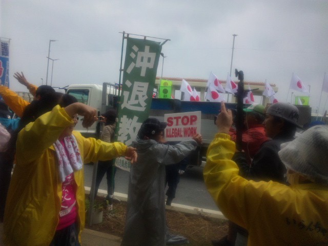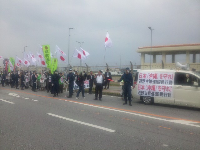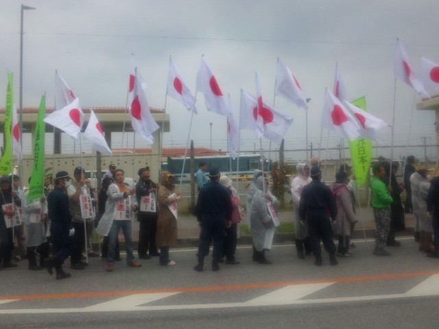11時半過ぎ、やってきた日の丸の集団。ネットを通じて全国的な呼び掛けをしたらしいが、人数は30人足らずだった。例によって大音響のスピーカーで「日本を中国に売り渡す沖縄県民!」とがなり立て、ゼッケンやプラカードには「辺野古推進」「日本を守れ!」「沖縄を守れ!」の文字。
