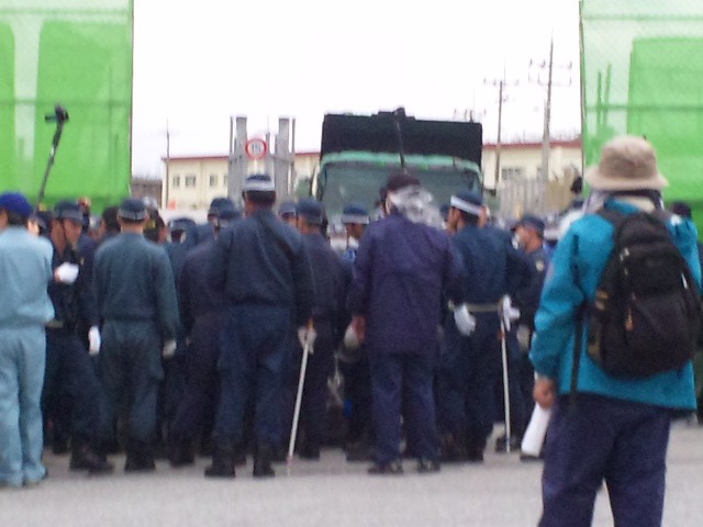 16:20、やっとやってきた機動隊は、基地から出てくる工事車両を通すために、バリケードを黙々と排除。二十数人残っていた市民たちは、道路反対側からしっかり見学させてもらった。
