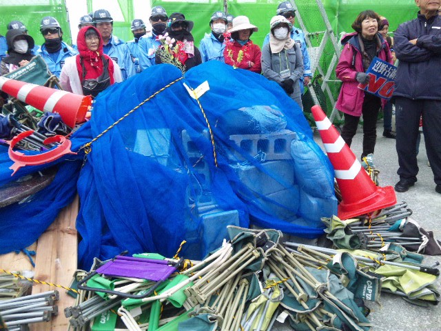 すぐにバリケードを再構築、誰かがオブジェ・「崩れゆく安倍政権」と命名!14:30、四回目の座り込み排除のために人々を取り囲んだ機動隊に対し、ゲート前行動のリーダー・山城博治さんは言った。「崩れゆく安倍政権と名の付いたオブジェを機動隊の君らが取り崩していいのか?皮肉だな!」