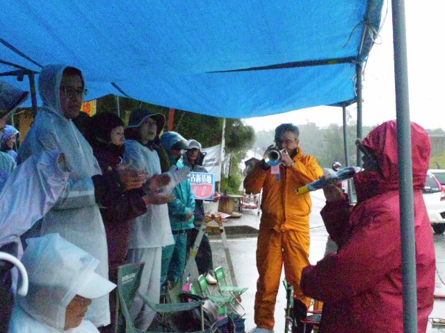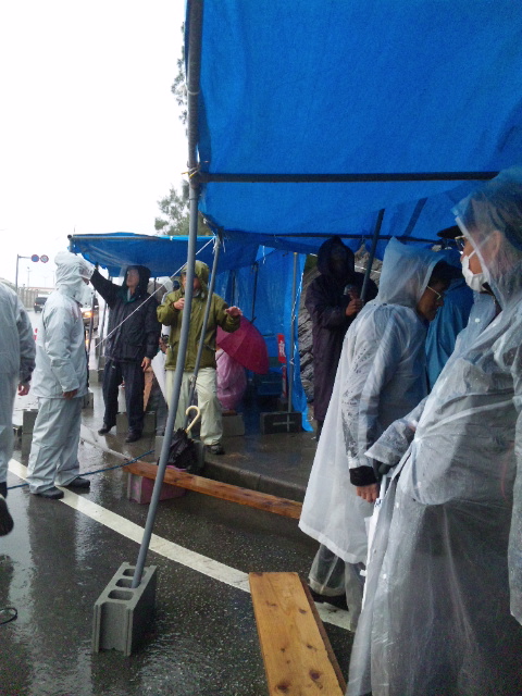 ゲート向かいに雨除けのテントを構築、座り込むことに…。