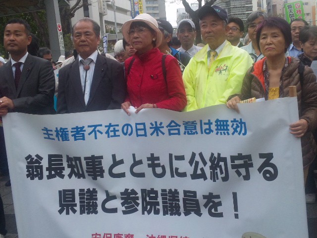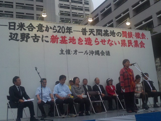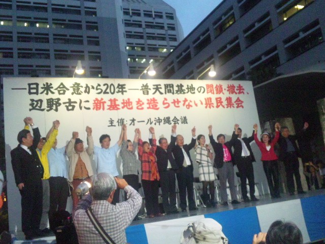 那覇市の県庁前で、「普天間基地の閉鎖・撤去、辺野古に基地を造らせない県民集会」が開催され、雨の中1500人の人々が集まった。(主催:オール沖縄会議)