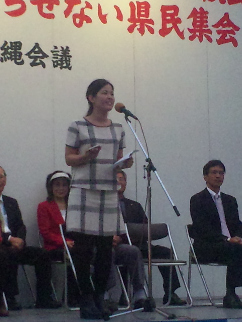各分野の代表が登壇、普天間基地の返還・撤去を訴えた。若者代表・シールズ琉球の玉城愛さんは、「返還合意のあった20年前の今日、私は満一歳の誕生日を迎えたばかりだった。私が成人してもまだ基地があり続けている。基地の存在が何を意味するか、知らない若者も多い。平和を願う皆さんの思いを、どうぞ若い人たちに語り掛けてください」と訴えた。