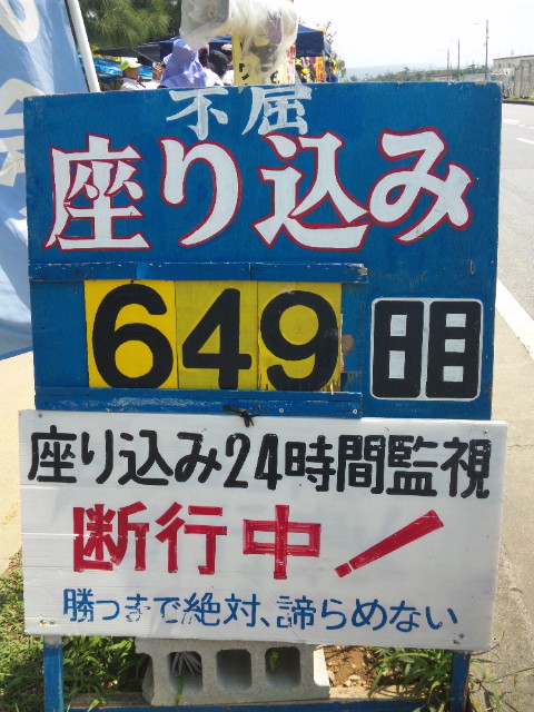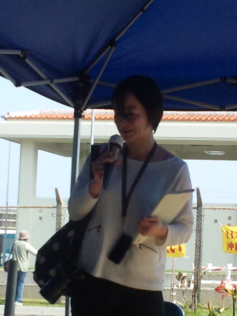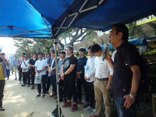 「小父さん」と言ってもこの方は、地元名護市の市会議員を10期・37年務める超人だ。座り込みが早朝6時だった時は毎朝、いまも議会がない日は毎日ゲート前でみんなと一緒にすわり込む。長年基地と向かい合って闘い・培ってきた地元ならではの細かい情報を、わかりやすく解説してくださる。