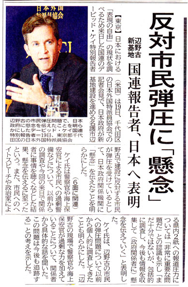 また、日本における言論・表現の自由の状況を調べるために来日した国連の連特別報告者のデービット・ケイ氏が 、日本での調査を終え、東京の外国特派員協会で記者会見、「日本は、メディアの独立が深刻な脅威に直面している」と警告を発した。(21日沖縄タイムス報道)