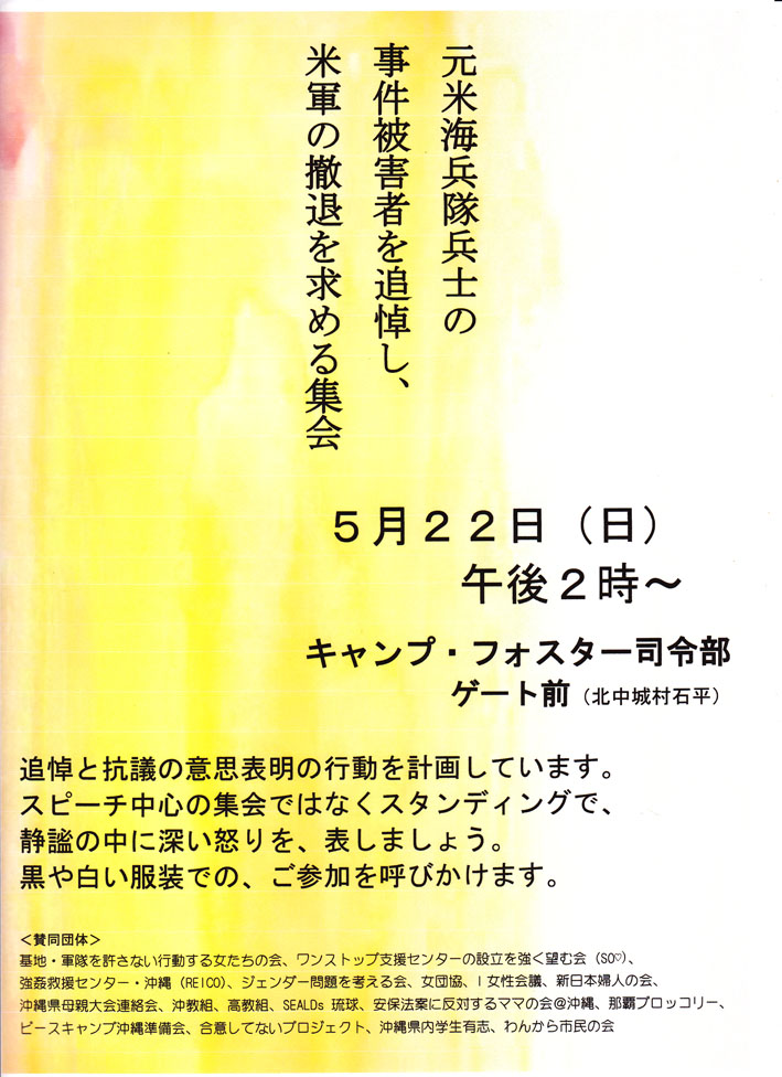 「財布も持たず、気軽にウオーキングに出かけた自宅近くで、こんな残忍な目に合うなんて、もはや沖縄にはどこにも安全な場所はない。いますぐ沖縄からすべての基地を撤去して!」