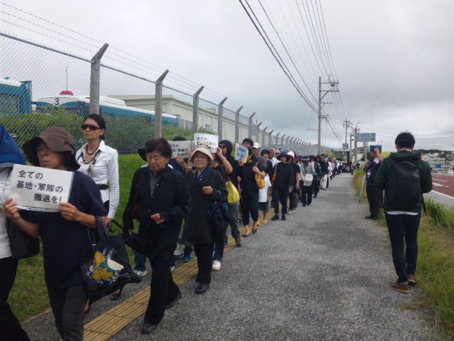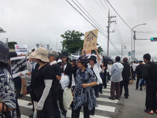 シュプレヒコールやガンバローなどの掛け声はなく、「命をかえせ」「「すべての基地・軍隊の撤退を!」などのプラカードを掲げ、喪服や喪章を付けた人々2000人が、被害者が受けた恐怖、痛み、苦しみ、無念に思いを馳せながら、整然と無言で一時間フェンス沿いを行進した。