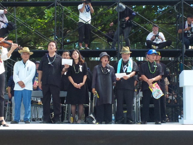 県民大会は古謝美佐子さんが歌う「童神(わらびがみ」で始まりました。子を想う親心を詠うこの歌が、被害者への思いと重なって参加者の胸に浸みわたり、続いて行われた一分間の黙祷のなか、こらえきれず涙を流す人も少なくありませんでした。