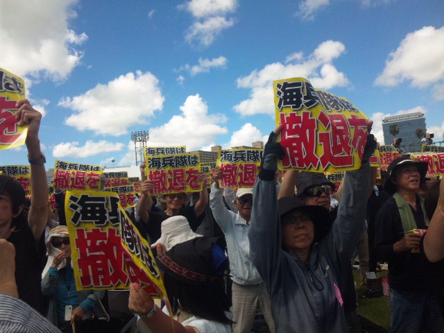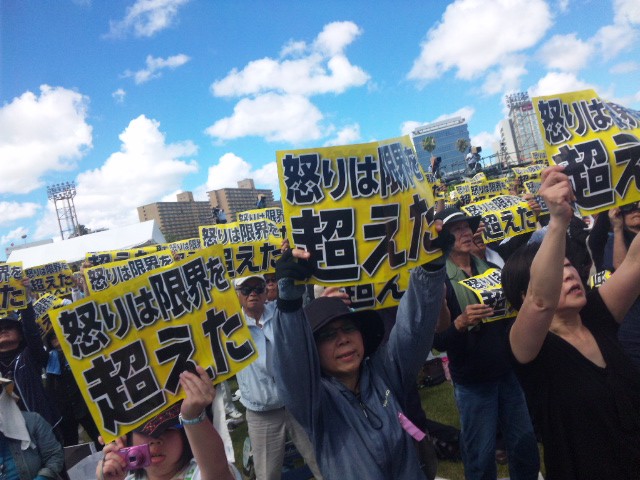 大会の主催者・オール沖縄会議の4人の共同代表もそれぞれに挨拶に立ち、その一人・被害者と同世代で大学生の玉城愛さんは「安倍晋三さん、本土に住むみなさん、第二の加害者はあなたたちです!沖縄とちゃんと向き合って下い」と、沖縄の民意など一顧だにしない政権と、無関心な国民に対して、痛烈な批判を投げかけました。