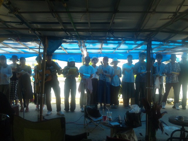 11:20、ゲート前のテント村に着くと、入れ替わるように2台のバスがでていくところだった。関西から9条運動関連の仲間たち90人が、座り込みに参加したそうだ。