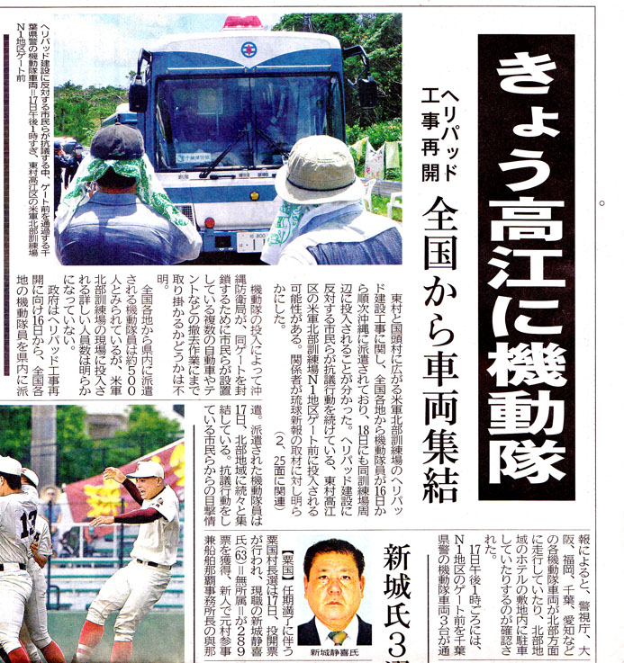 オスプレイのヘリパッド建設に反対して住民が座り込みを行っている東村の高江に機動隊を導入して、工事再開のための資材搬入を始めた。