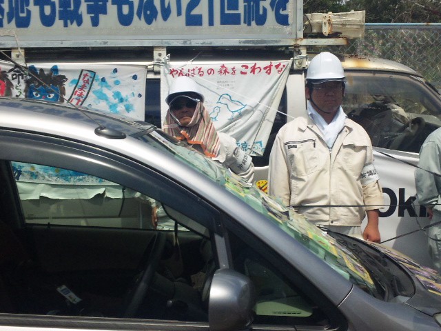 <抗議住民の車の前に張り付く防衛局職員。全国から動員され、24時間3交代で15人ずつがただ立ち尽くしている>