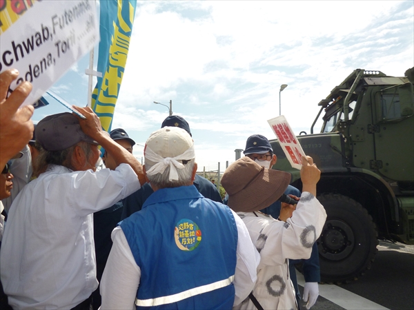 何度も何度も機動隊に押し返されながら、それでも元気に基地から出てくる米軍車両を止め続けた。