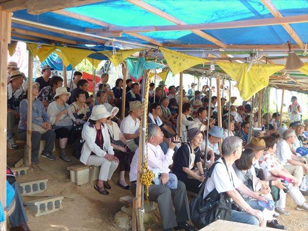 土砂降りの大雨に見舞われたので、午前中後半はテントの下での集会に。全国の歴史教育に携わる教師たちのグループ(歴史教育者協議会)200人が、二組に分かれてやってきて、テントの中は一気ににぎやかに。