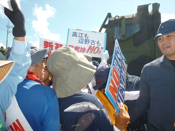 読谷では、トリイステーション基地のゲート前で、村民をを中心にした人たちが「NO BASE」を掲げて抗議の意思を表明している。