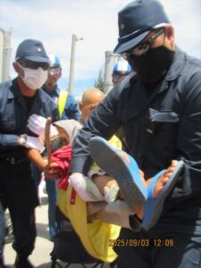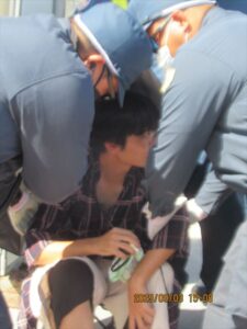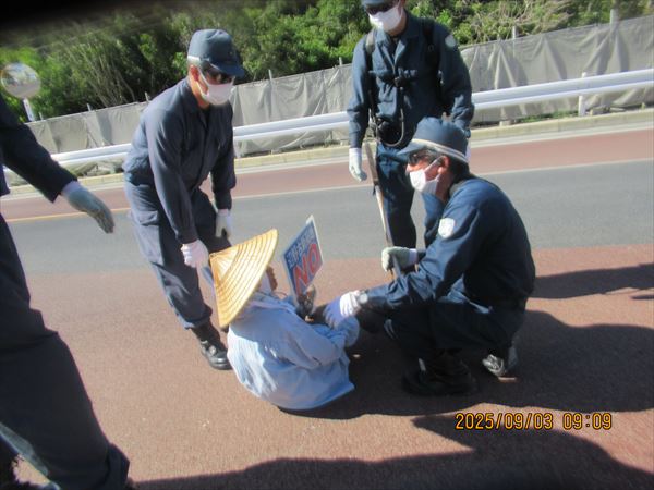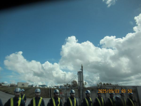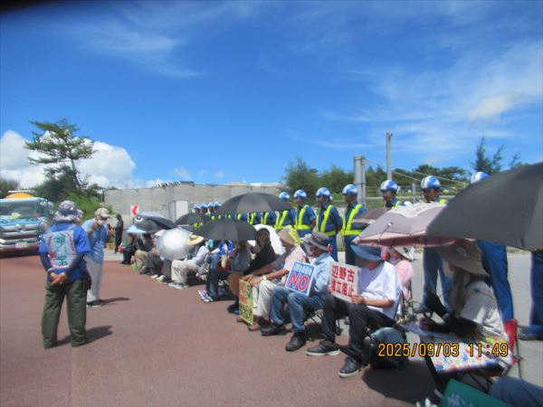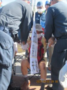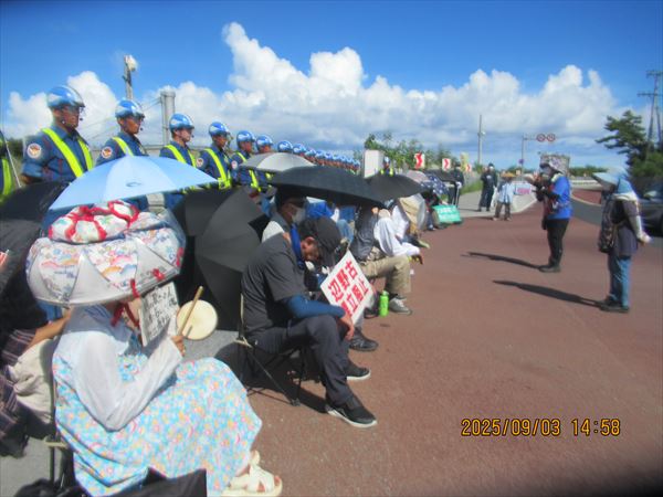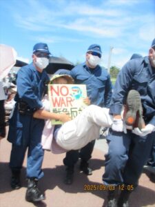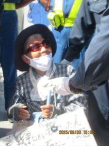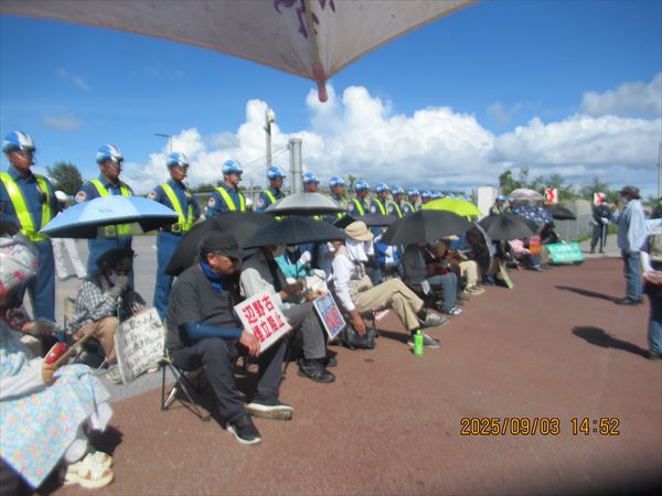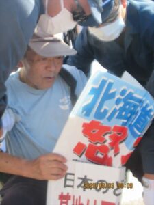 この日目立っていたのは、北海道からやって来たオール室蘭・札幌の6人の方々。「北海道から怒る」「軍拡は殺人未遂」のメッセージ・ボードが光っていた。(写真は許可を頂いて写しています)「軍拡に前のめりになっているこの国の状況は、決して沖縄だけの問題ではないが、ただ米軍基地が集中するここ沖縄が、真っ先に戦場にになるのは間違いない。沖縄の現状を学び、共に闘っていきたい」と連帯のあいさつ。