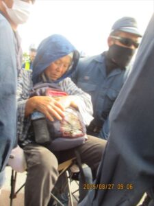 1回目の座り込み、車いすが2台、島袋文子さんとヒロシさん。車いすでも熱心に辺野古に通うお二人には頭が下がる。