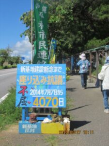 この日は海上の時化で安和桟橋や本部港の抗議行動が休みになったため、糸満島ぐるみや本部島ぐるみのメンバーも辺野古の座り込みに参加、3回目の座り込みまで参加者が40人を下らなかった。(不屈の座り込み抗議4063日目の辺野古から)